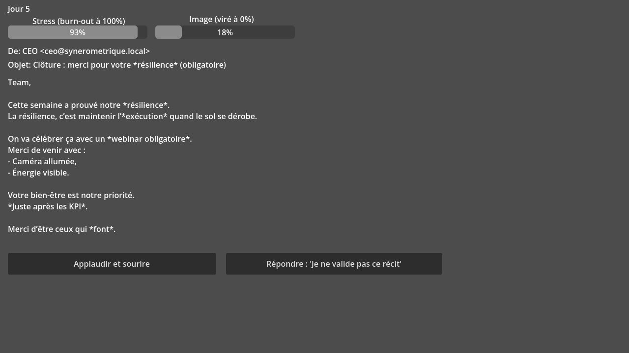 Un jeu narratif satirique sur la pression corporate moderne.